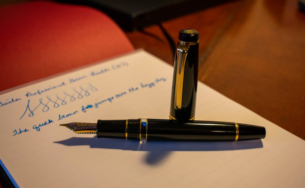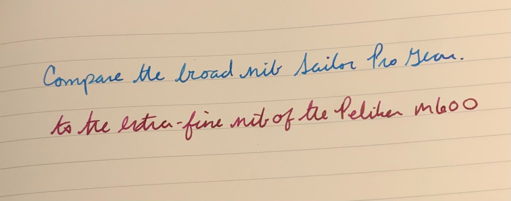 When I first held this pen in my hand, I was enamored. It is a little heavier and a little longer than the standard Sailor Professional Gear pen. It just looks and feels great. The piston filler works great, with a smooth action that feels very much like the Pelikan piston filler. When I first inked the pen and put the nib to paper, I actually made an audible sound of pleasure. The broad Sailor nib writes just slightly broader than most of my medium nib pens and the writing experience is, in my opinion, ideal. Ironically, the broad nib on the Sailor writes pretty much the same stroke width as the Pelikan m600 extra-fine nib. (See Below) I have nothing but good things to say about this pen. Go get one! Buy Here